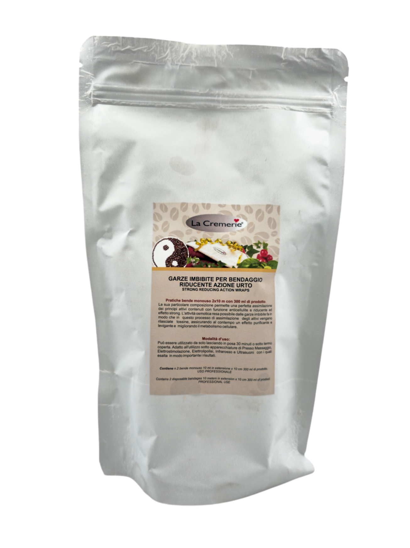 La sua particolare composizione permette una perfetta assimilazione dei principi attivi contenuti con funzione anticellulite* e riducente ad effetto strong. L'attività osmotica resa possibile dalle garze imbibite fa in modo che in questo processo di assimilazione degli attivi vengano rilasciate tossine, assicurando al contempo un effetto purificante e levigante e migliorando il metabolismo cellulare.