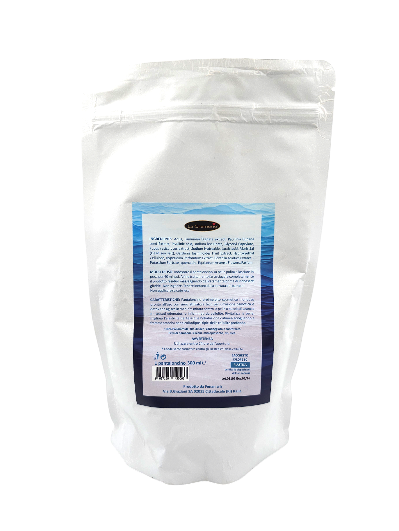 Pantaloncino preimbibito cosmetico monouso pronto all'uso con siero attivatore tech per una azione osmotica e detox che agisce in maniera mirata contro la pelle a buccia di arancia e i tessuti edematosi e infiammati da cellulite. Coadiuvato da microaghi di silice organico dell'equiseto rivitalizza la pelle, migliora l’elasticità dei tessuti e l’idratazione cutanea sciogliendo e frammentando i pannicoli adiposi tipici della cellulite profonda.