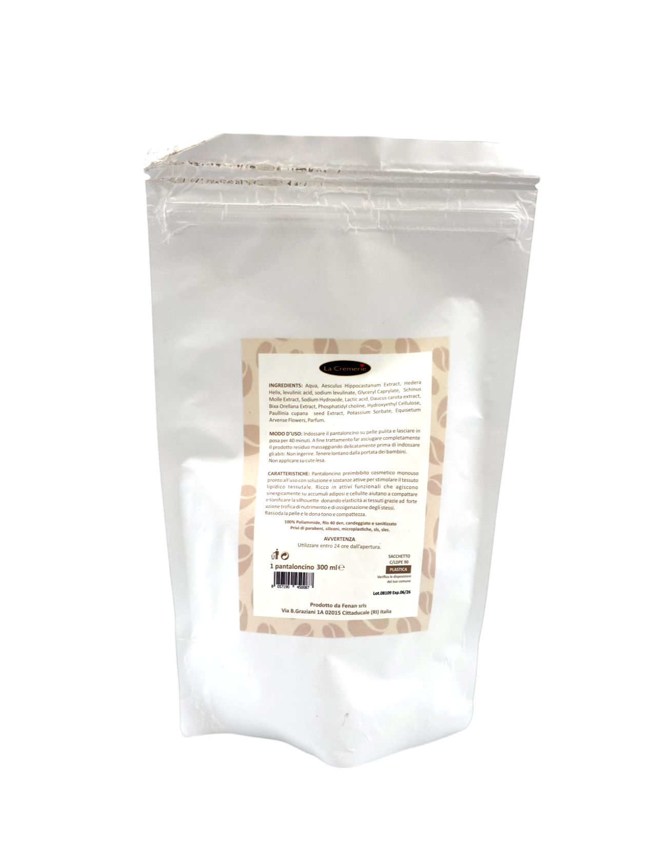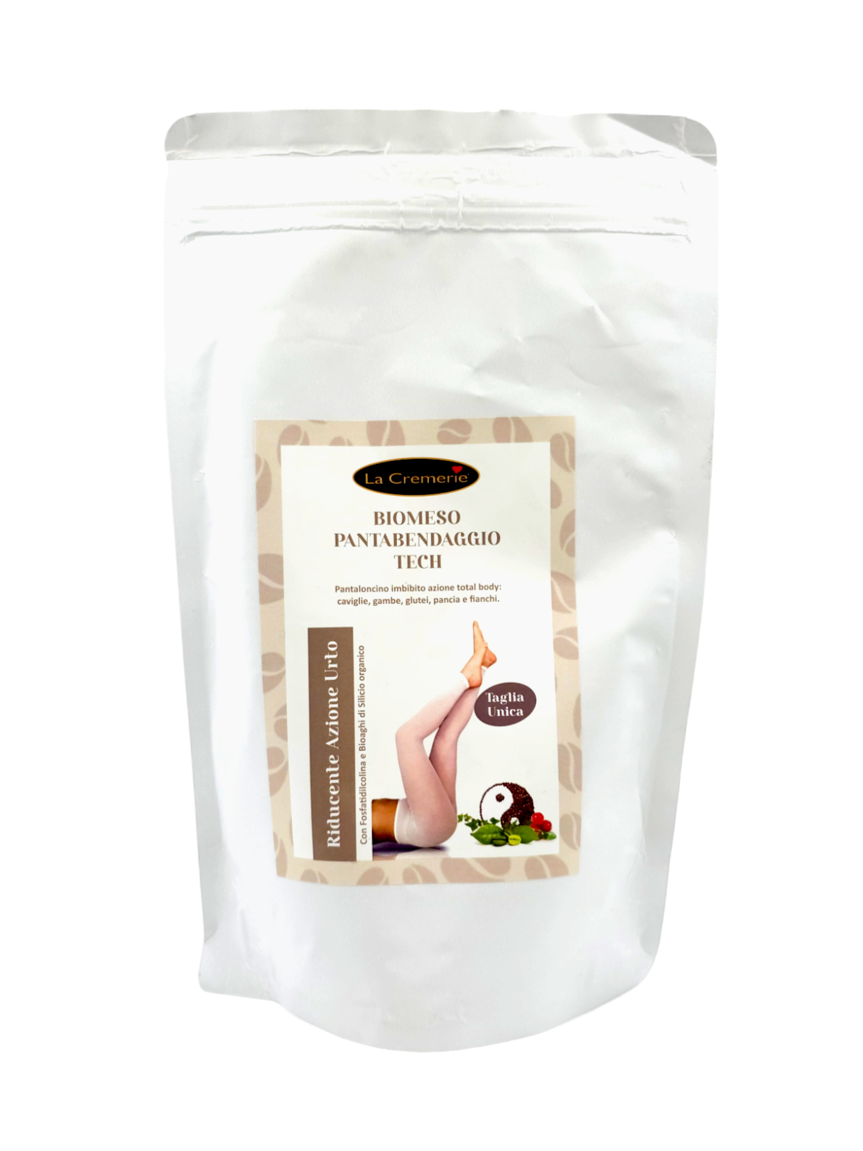 Pantaloncino preimbibito cosmetico monouso pronto all'uso con soluzione e sostanze attive per stimolare il tessuto lipidico tissutale. Ricco in attivi funzionali che agiscono sinergicamente su accumuli adiposi e cellulite aiutano a compattare e tonificare la silhouette donando elasticità ai tessuti grazie ad forte azione trofica di nutrimento e di ossigenazione degli stessi. Coadiuvato da microaghi di silice organico dell'equiseto rassoda la pelle e le dona tono e compattezza.
