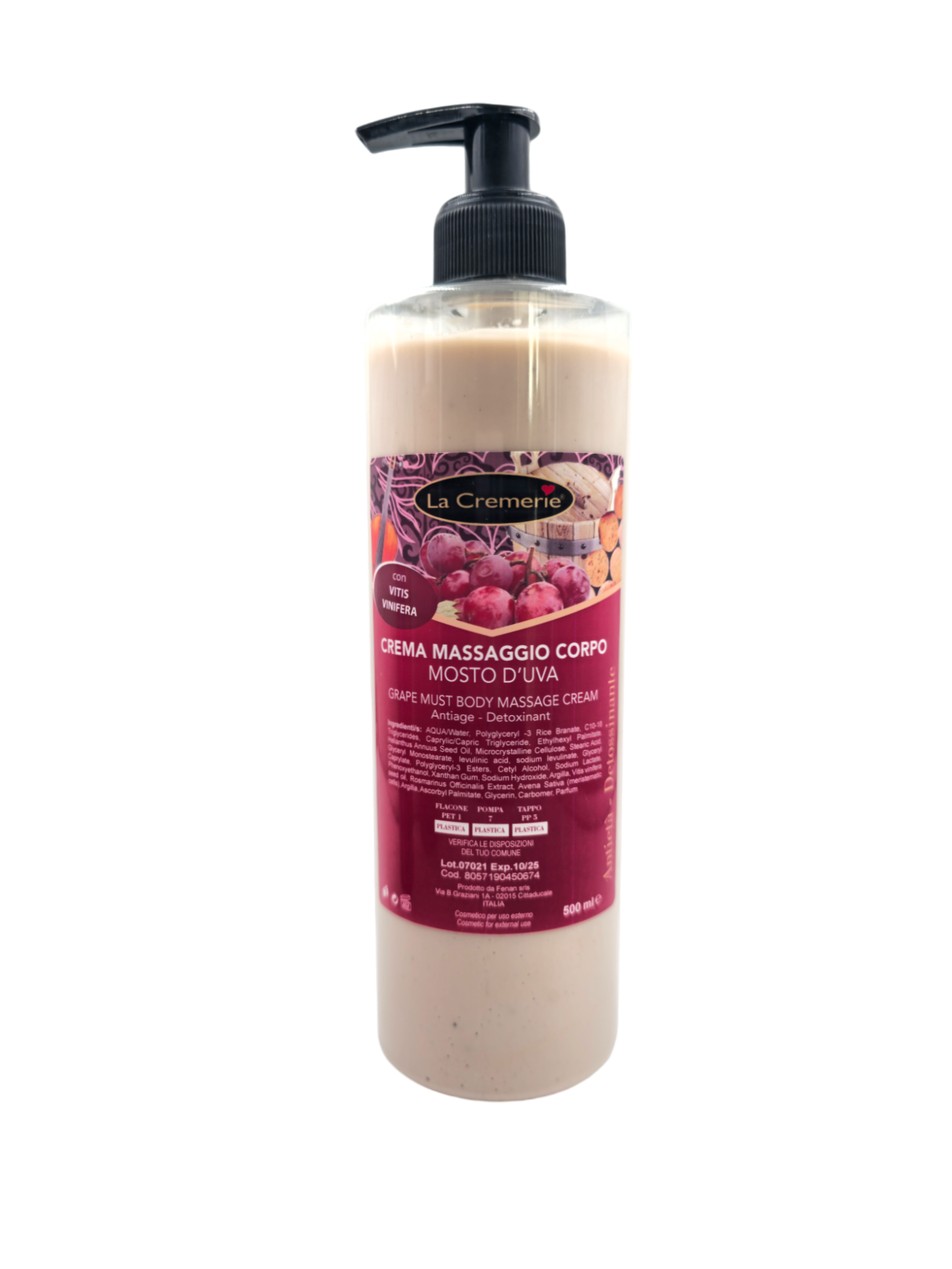Modo d'uso: E' possibile effettuare un doppio massaggio: prima su tutto il corpo con la crema massaggio e successivamente con l'olio massaggio mosto d'uva insistendo sulle parti da trattare funzionalmente in modo più specifico.