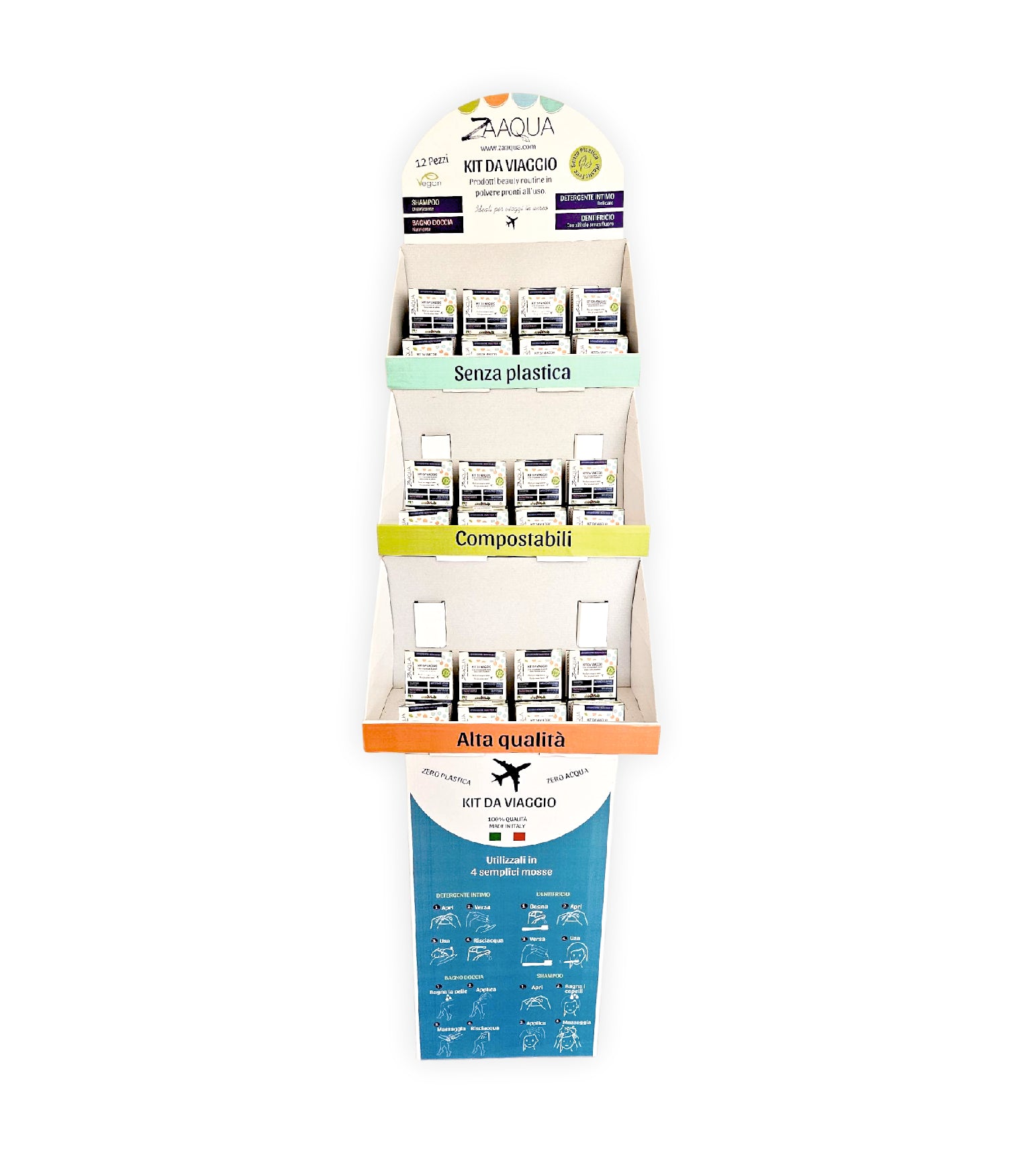 Espositore kit viaggio composto da 96 confezioni da 12 pezzi per referenza (1152 pezzi) così divise: 4 pezzi shampoo, 4 pezzi bagno doccia, 2 pezzi dentifricio, 2 pezzi detergente intimo.