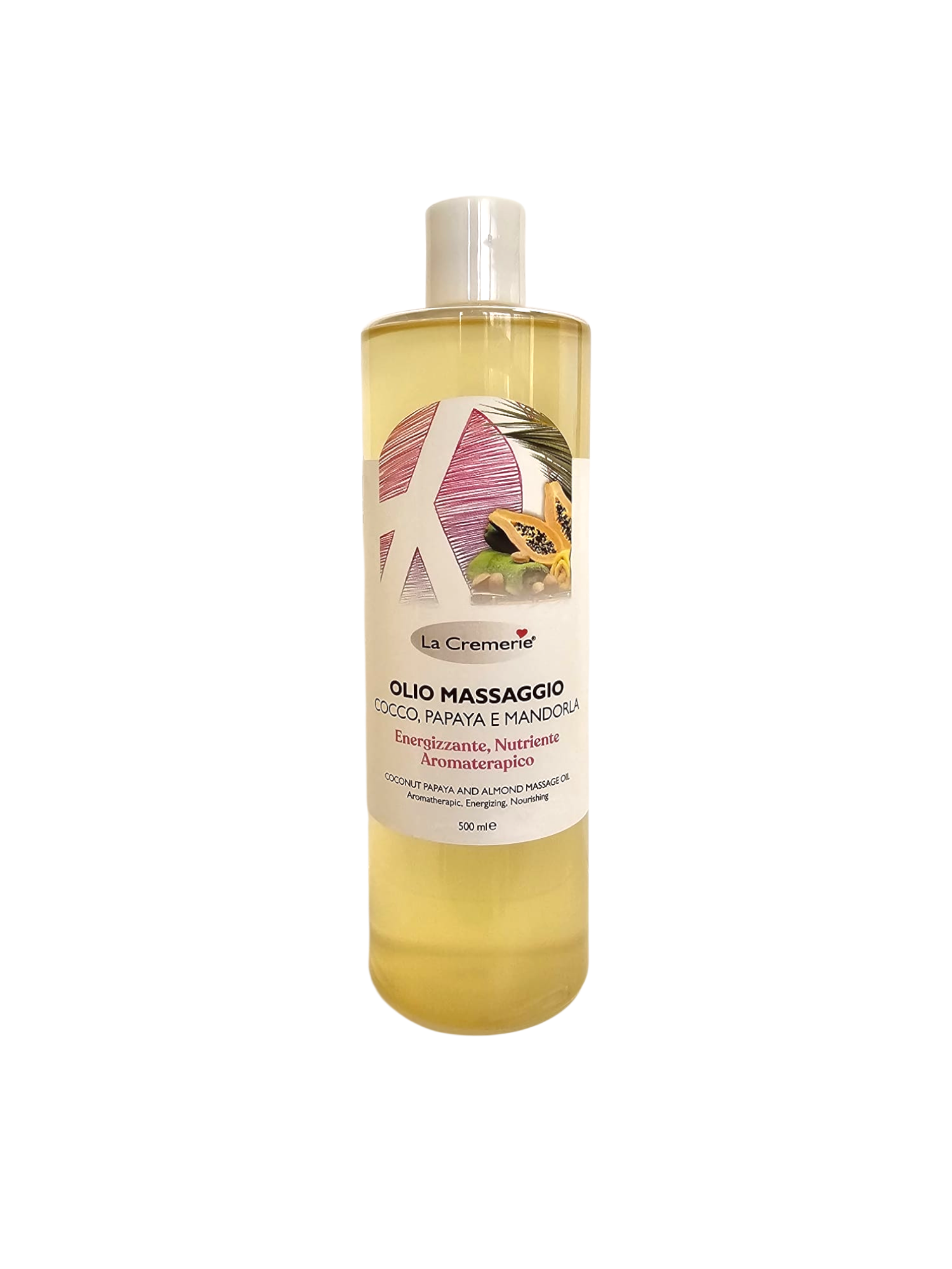 Olio massaggio nutriente con cocco, papaya e mandorla dolce ideale per massaggi rilassanti, rivitalizzanti e professionali.